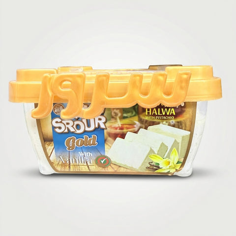 Experience the luxurious taste of Srour Gold with Vanilla, a delectable halwa with pistachios that perfectly blends rich flavors with a velvety texture. Ideal for dessert lovers, this Middle Eastern delicacy offers a delightful twist with its infusion of aromatic vanilla. Expertly crafted using high-quality ingredients, each bite delivers a satisfying crunch of pistachios complemented by the sweet, fragrant vanilla notes. Whether you are hosting a special occasion or simply indulging yourself, this exquisite treat is sure to impress. Enjoy it as a delicious end to a meal or as a scrumptious snack any time of day.