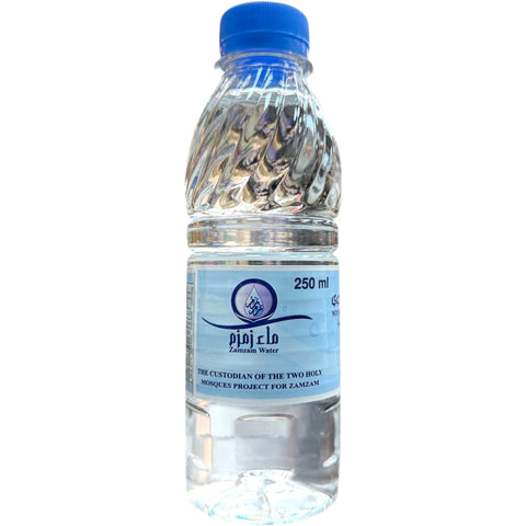 Zamzam Water 250 ml bottle displayed on a white background, showcasing its hydration benefits.