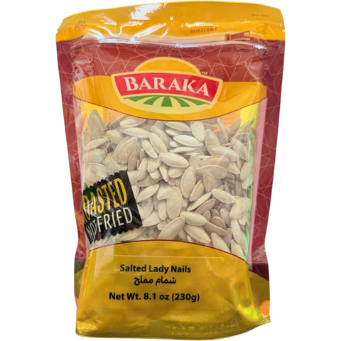 Enjoy the unique flavor and crunch of Baraka Salted Lady Nail Seeds 230g, a nutritious snack packed with essential nutrients.